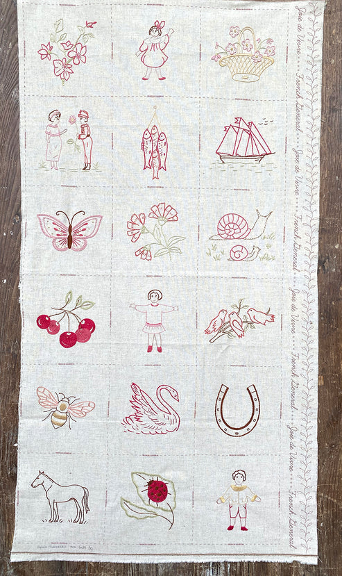 This is a panel for embroidery blocks, printed on sturdier linen-cotton fabric, 70% cotton, 30% linen, 44-45" wide, machine washable in cold, tumble dry low. Each panel is 24" long and runs through the entire width of fabric, 44".