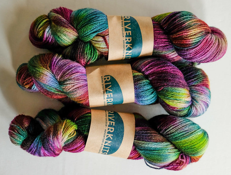 This is one of the five newest colors of NENE 4-ply yarns from RiverKnits company. This company does a wonderful job of sourcing Bluefaced Leicester and hand-dyeing it in the amazing colors, all in Britain.